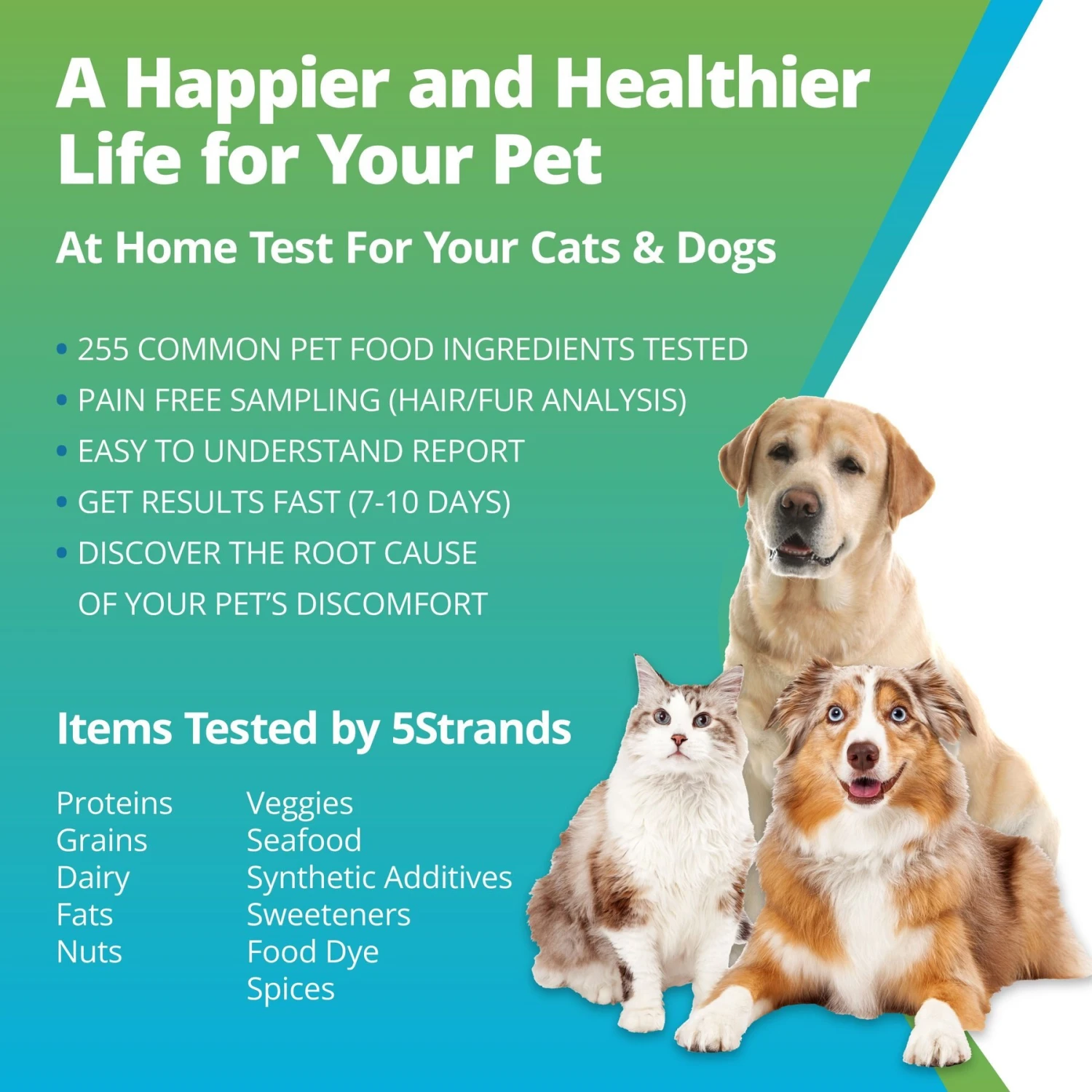 - Uses your pet’s hair for painless, convenient testing.