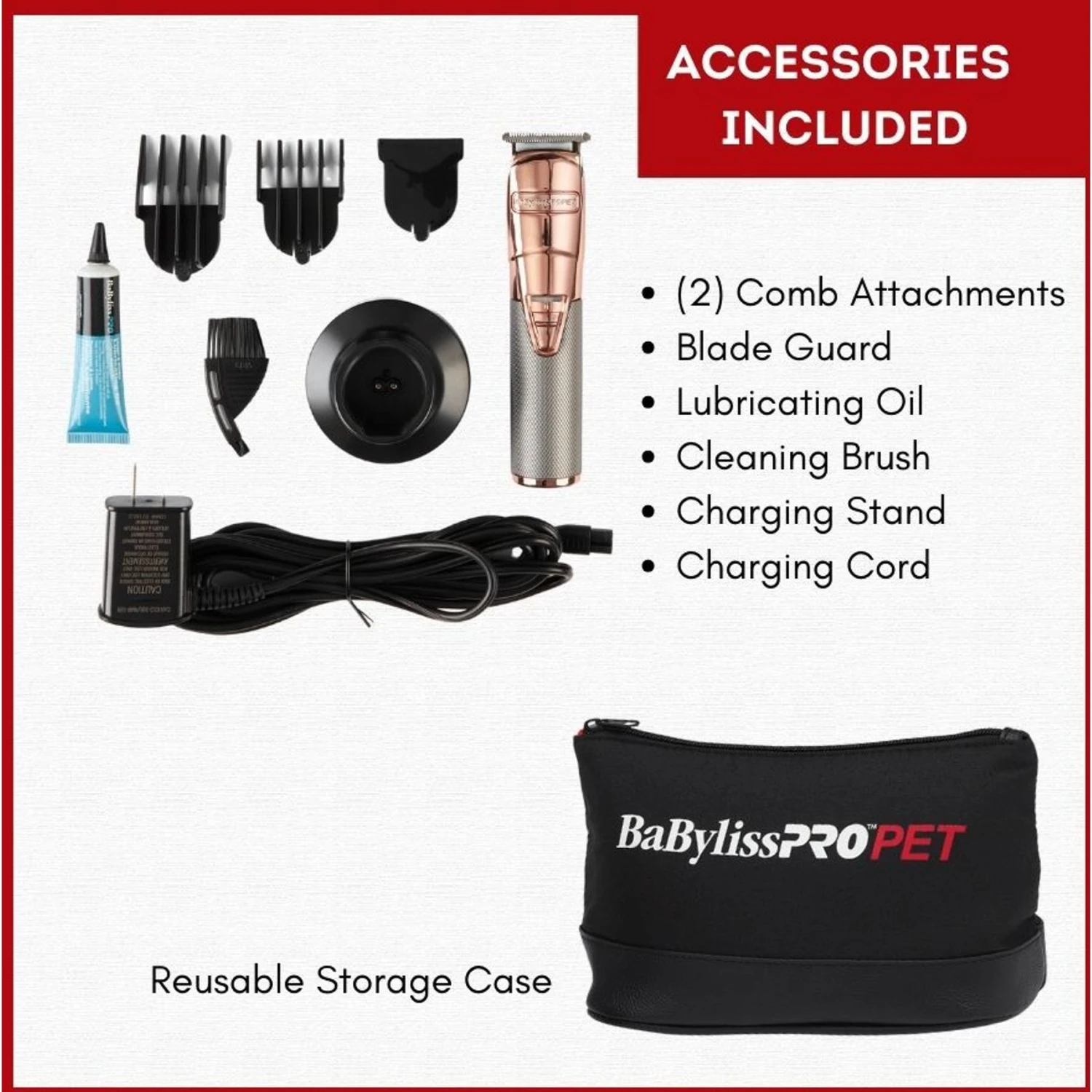 - You’ll love the included charging stand, 2 comb attachments, blade guard, lubricating oil, cleaning brush and carrying case that makes for easy storage.