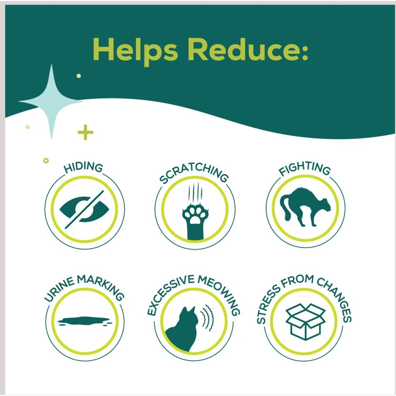 - Designed to help alleviate stress-induced negative behaviors like unwanted scratching, hiding, fighting, urine marking, and excessive meowing.