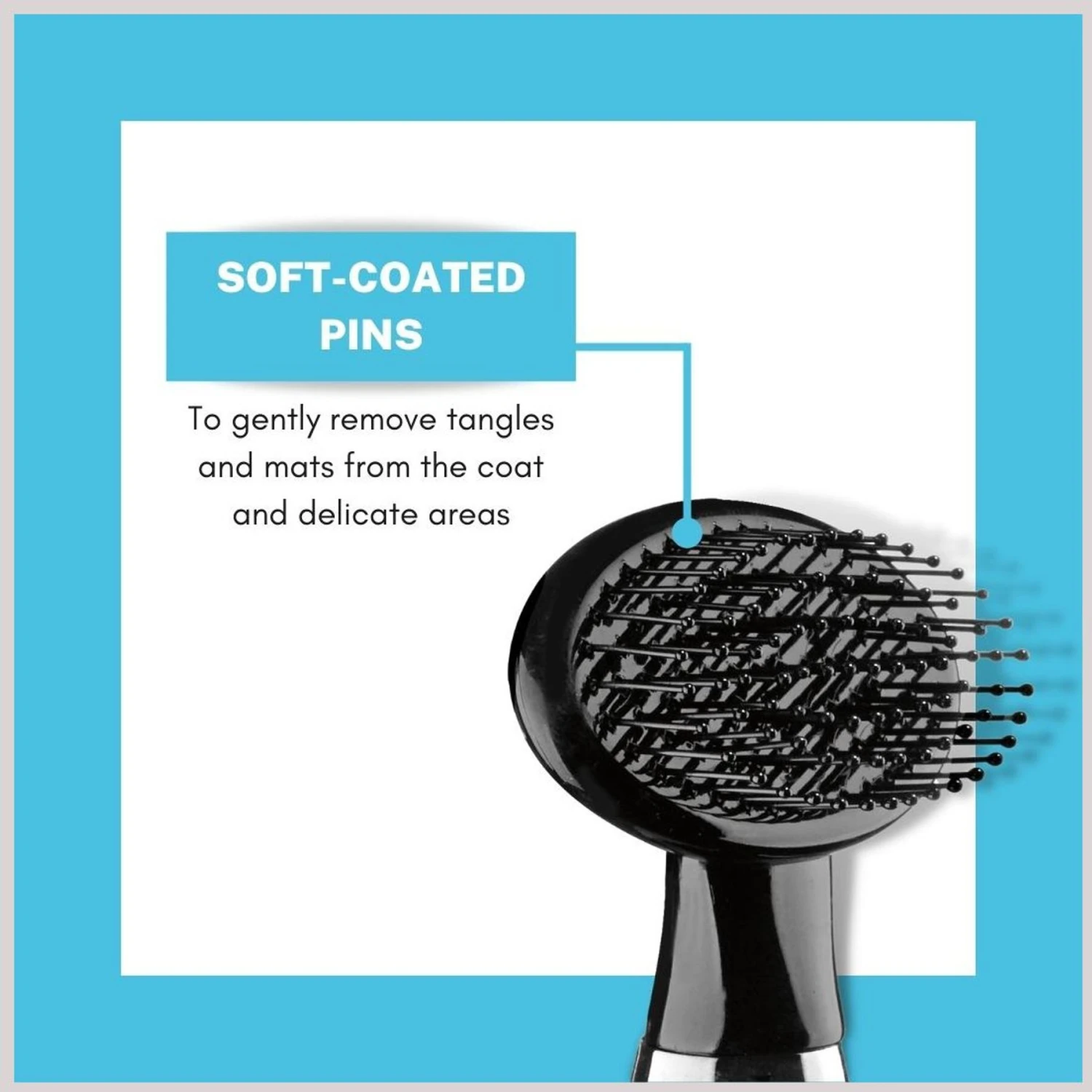 - Penetrates coat with gentle pins capped with reinforced tips to remove tangles and snarls.