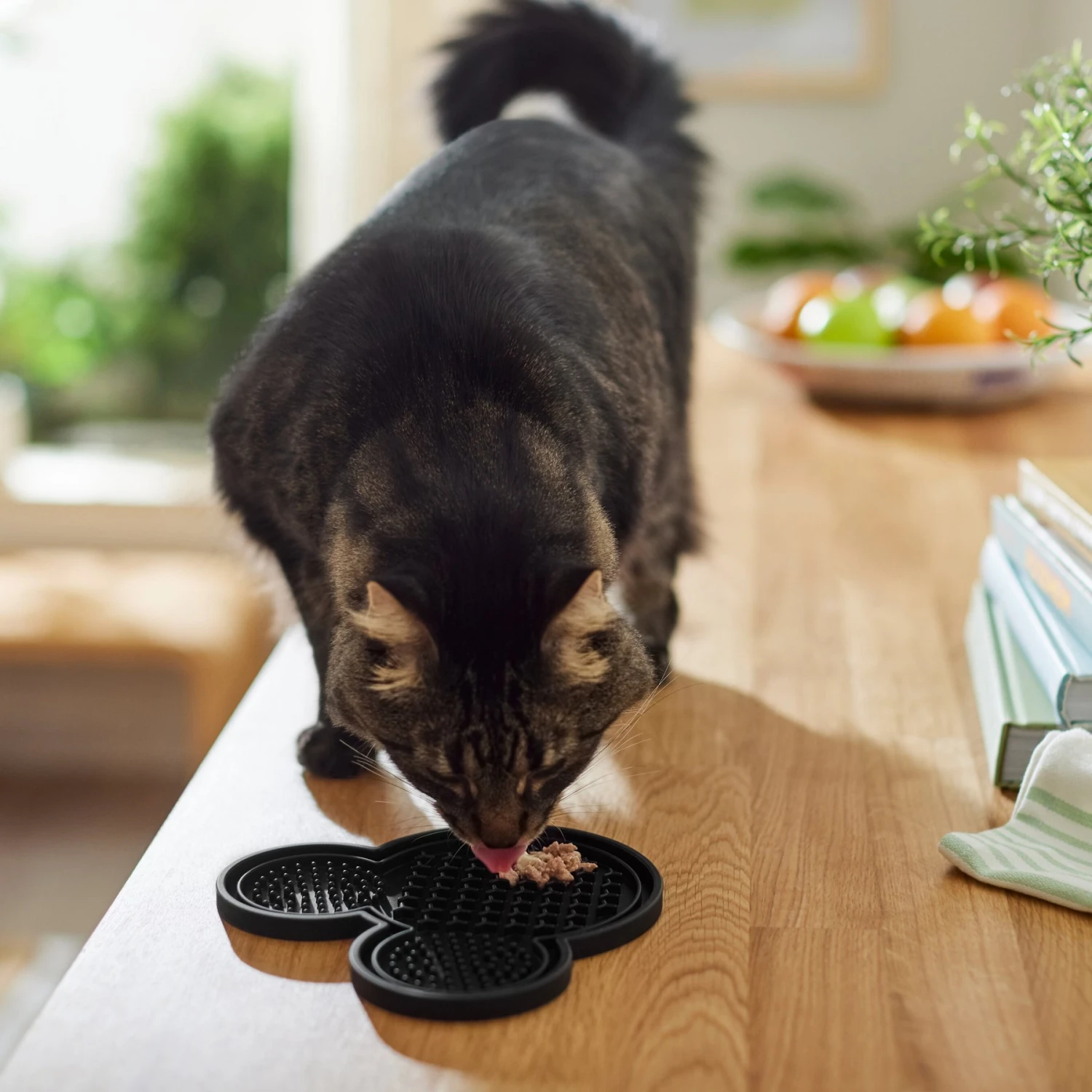 - This textured mat is ideal for spreadable treats for both dogs and cats.