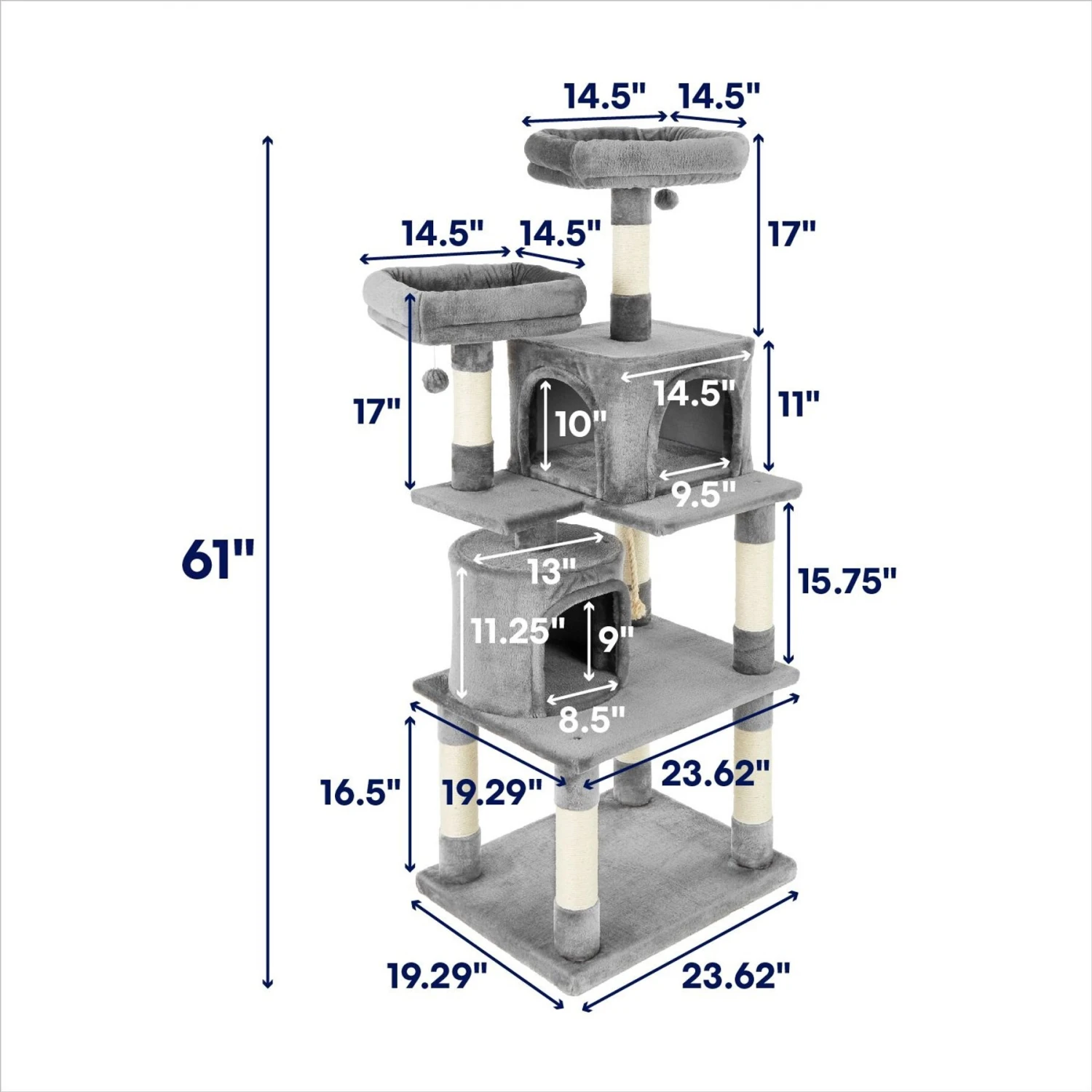- This cat tree has all your kitty’s needs covered by providing cozy spots to relax in, hideouts to retreat to at their leisure, scratching and perching opportunities, and playtime fun.