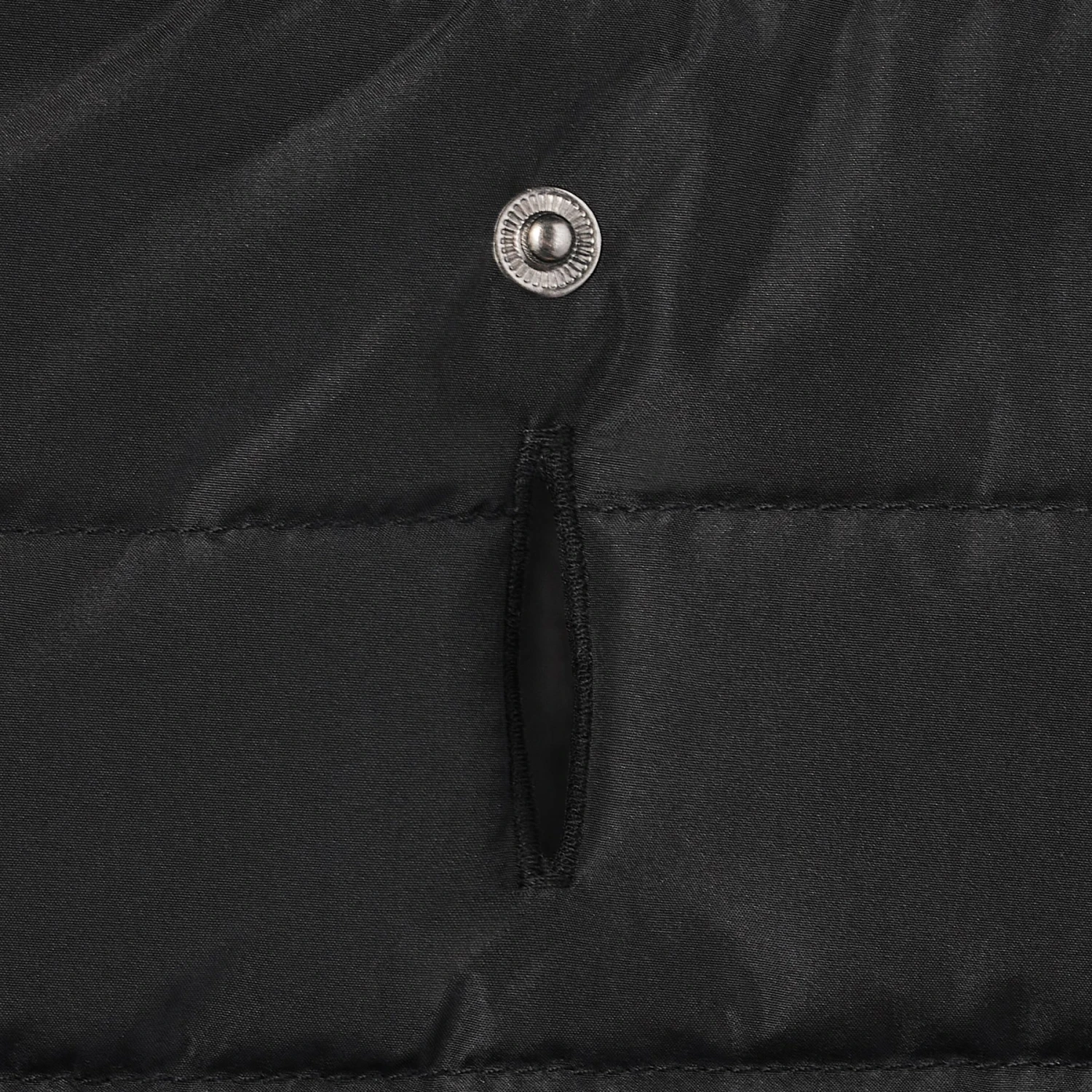 - Hook-and-loop fasteners up the belly and a snap button at the neck offer a snug, effective fit.