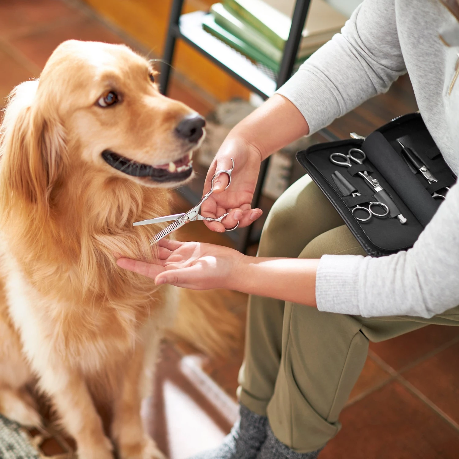 - Comes with 6.5” rounded-tip curved scissors, 6.5” thinning grooming scissors, 6.5” rounded-tip scissors and a pair of 4.2” rounded-tip scissors.