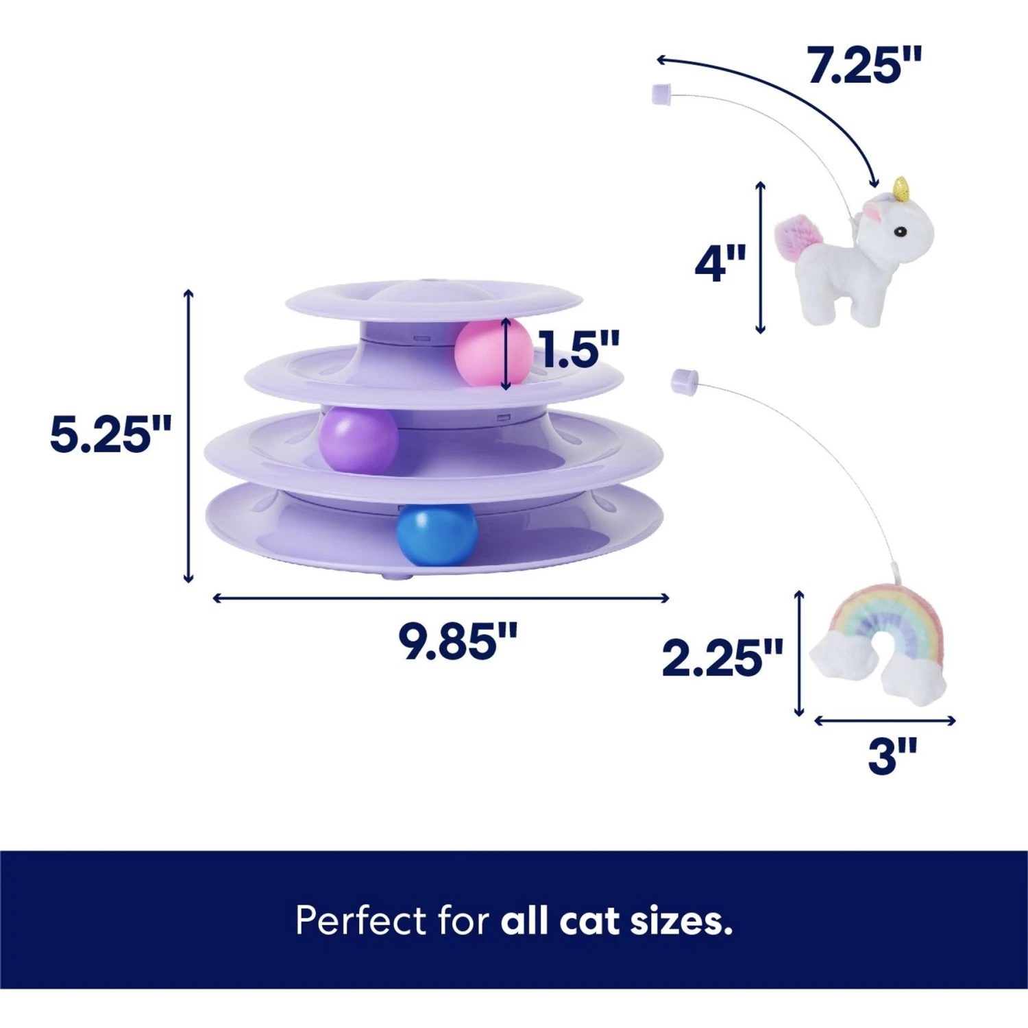 - Includes three-tier track, three colorful balls, and unicorn and rainbow pieces that include catnip inside.