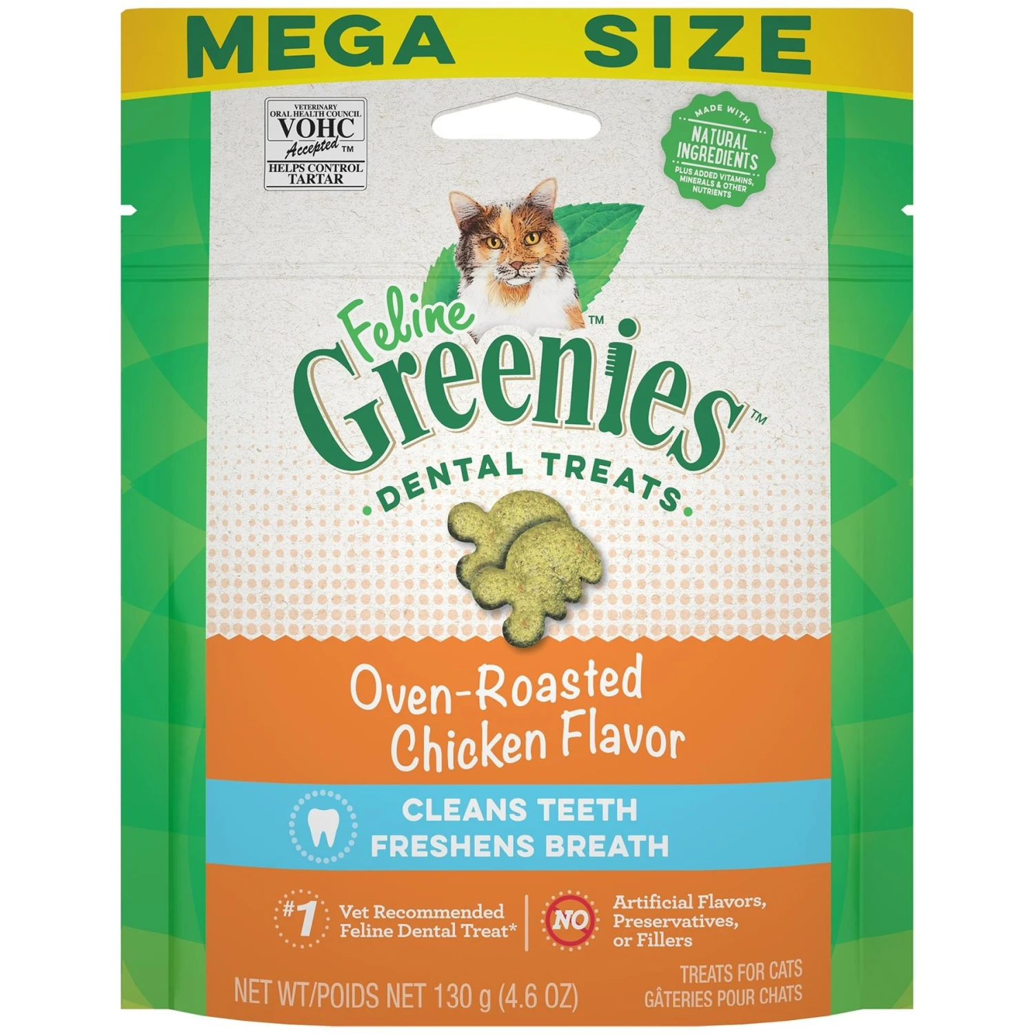 Greenies Feline Oven Roasted Chicken Flavor Adult Dental Cat Treats, 4.6-oz bag—Keep your feline friend’s purr-ly whites healthy and clean with FELINE GREENIES Adult Dental Cat Treats, Oven Roasted Chicken Flavor. Designed to help clean teeth, reduce tartar buildup and freshen your cat’s breath, these crunchy treats are made with natural ingredients plus added vitamins, minerals and other nutrients that make them a nutritionally complete and balanced snack for an adult cat. What’s more, they contain no artificial flavors, preservatives and are fewer than two calories per treat. Let your pampered pal crunch away on this yummy chicken-flavored treat that’s paw-some for the teeth and the tummy!