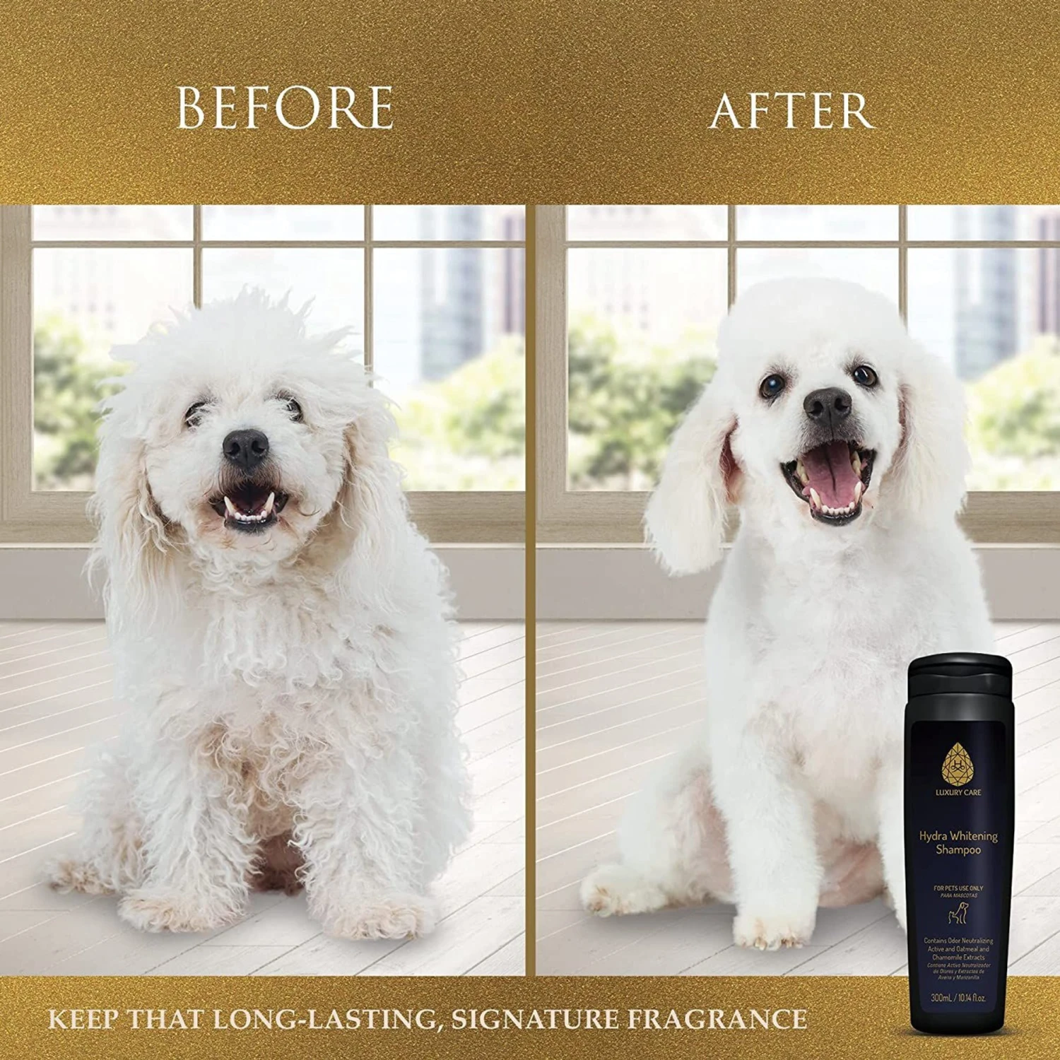 - This moisturizing and whitening dog shampoo has a brightening formula that tackles stains and yellowing without harmful bleach, revitalizing your pet’s coat and leaving behind a lustrous shine.