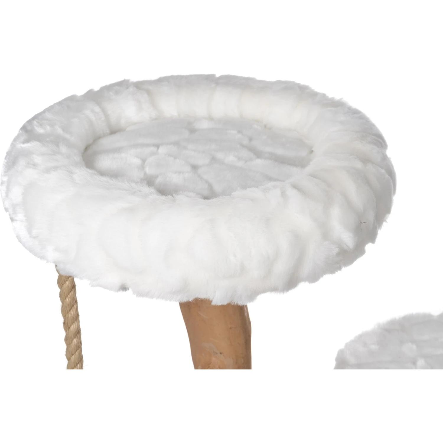 - A cushioned cat bed and plush-covered platform give her places to rest and watch the room.