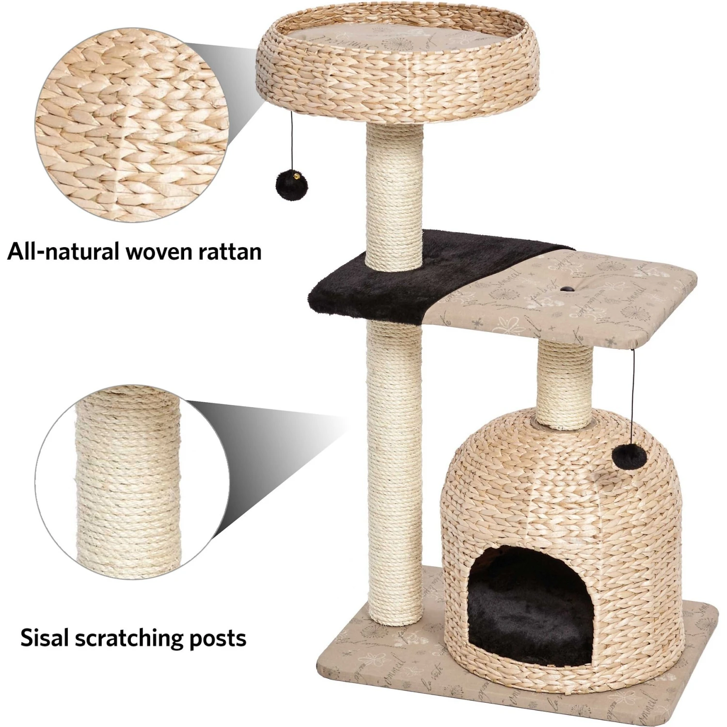 - Durable cat tree made of stunning, all-natural woven rattan.