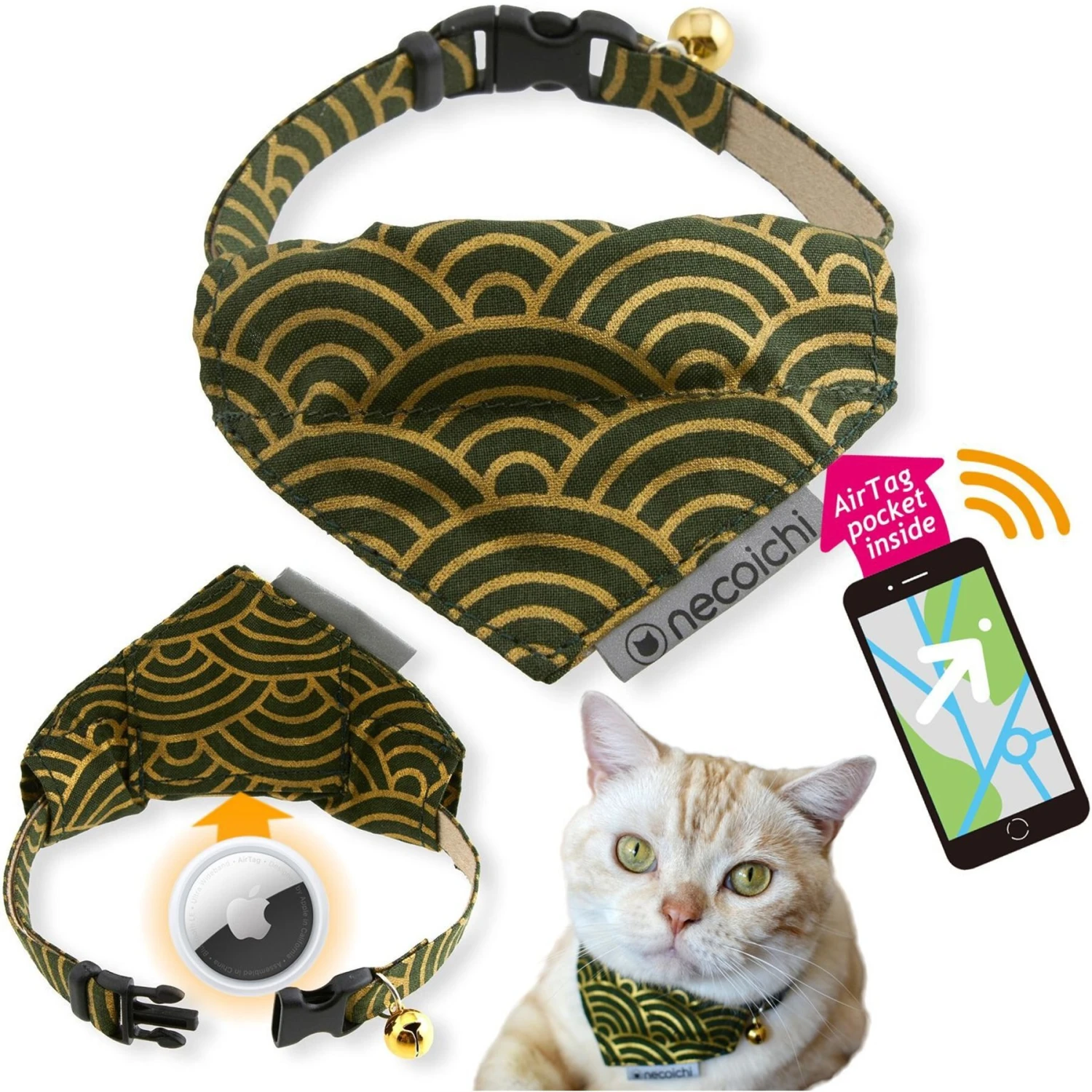 Necoichi Bandana Cat Collar With Air Tag Pocket, One Size