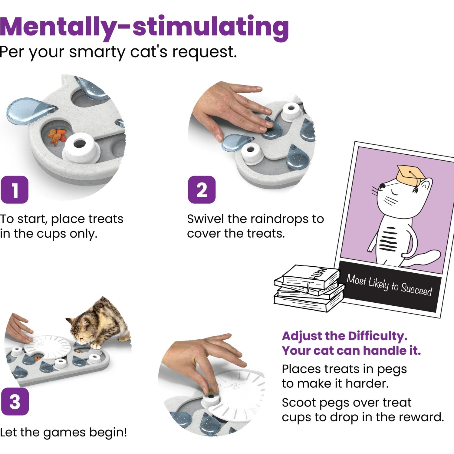 - The purr-fect toy for curious cats, this toy helps encourage their natural foraging instincts as they bat the pegs and swat the rain drops to find the hidden treats.