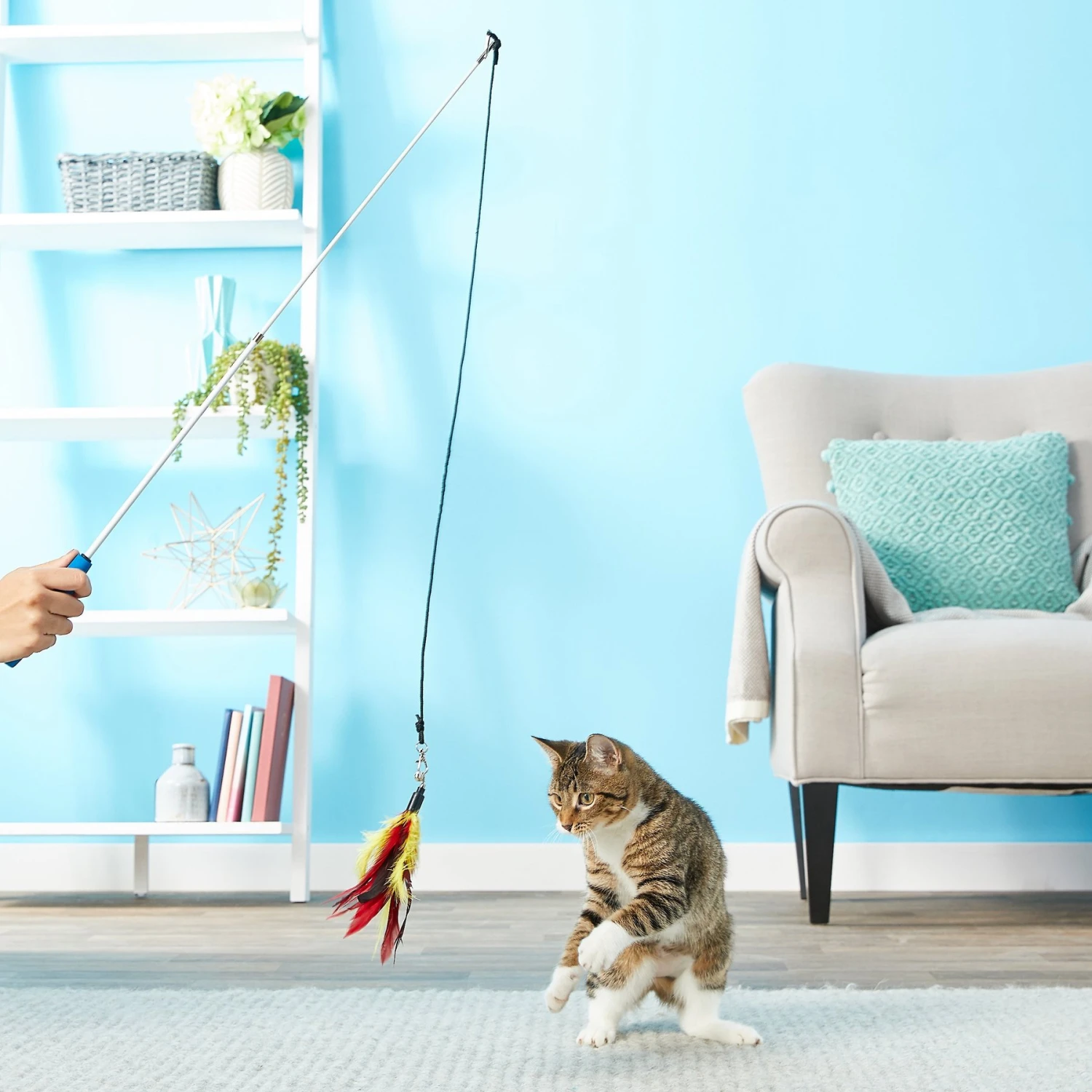 - Comes with two feathery attachments for your cat to chase and a detachable bell to keep her interested.