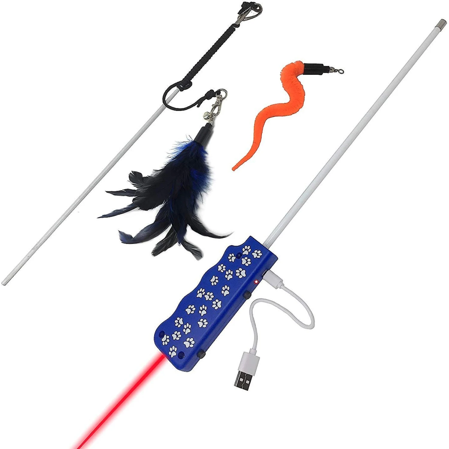 - This unique wand combines several of your feline’s favorite toys in one: dangling teasers, a laser pointer and engaging bird sounds.