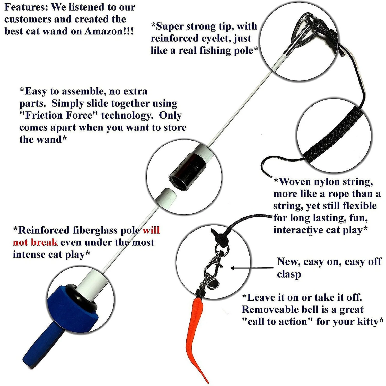 - Pole features a super strong tip with reinforced eyelet, and the string is made of rope-like nylon that won’t strain or fray.