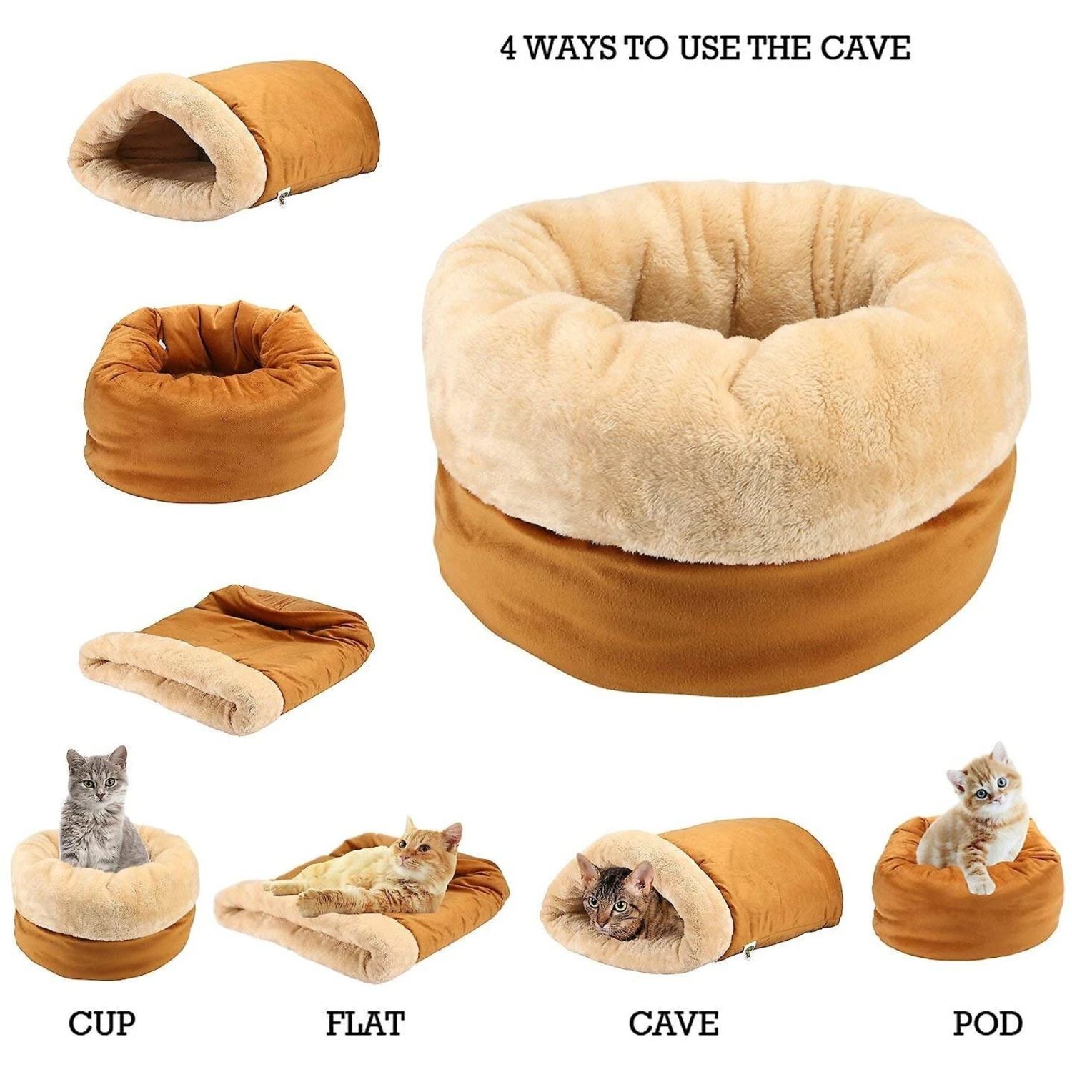 - Configurable into multiple shapes: a cave to burrow in, a flat “mattress” to stretch out on, and the fur-lined “cup” or microfiber-lined “pod” to curl up in.