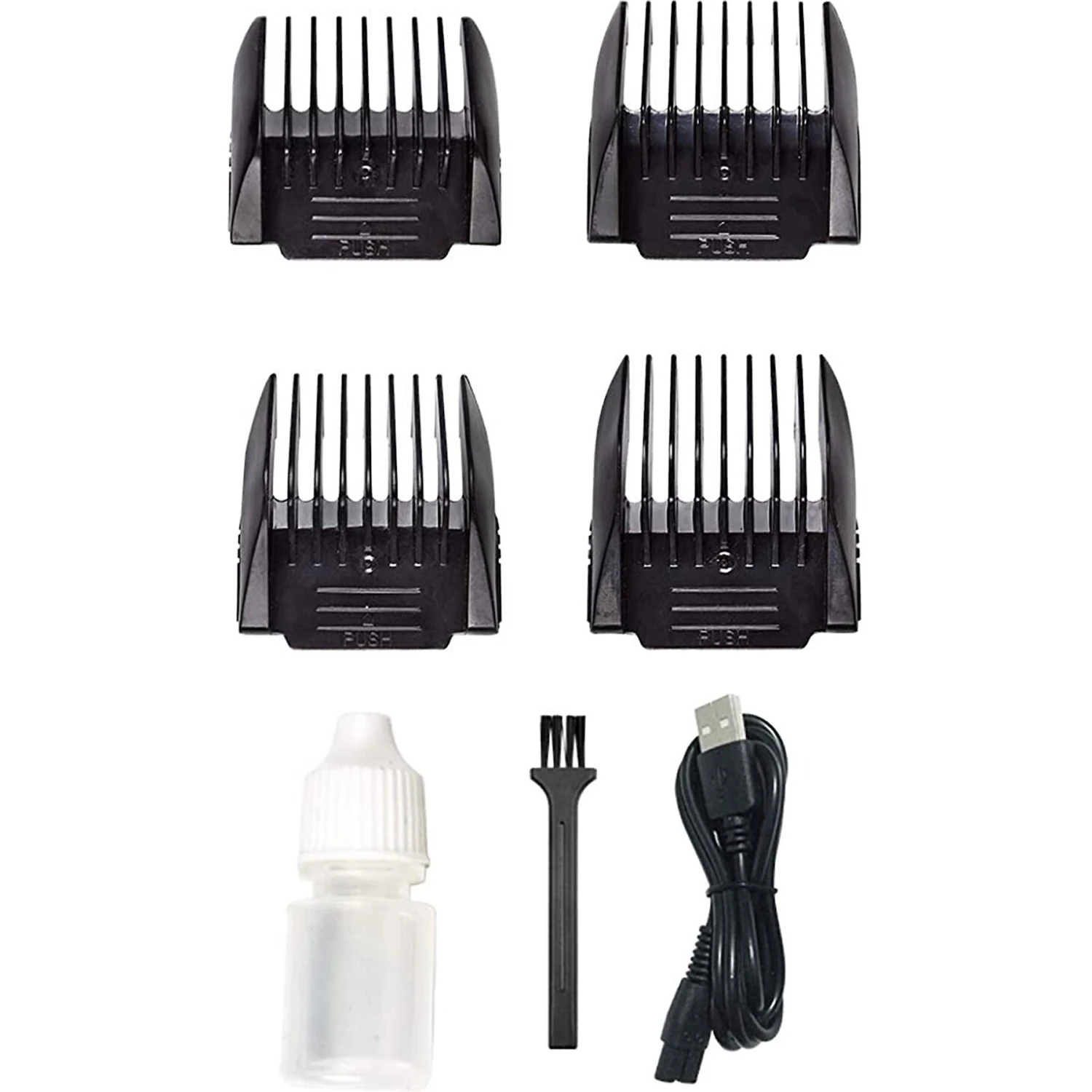 - Includes 4 attachment guiding combs, a cleaning brush and an oil bottle.