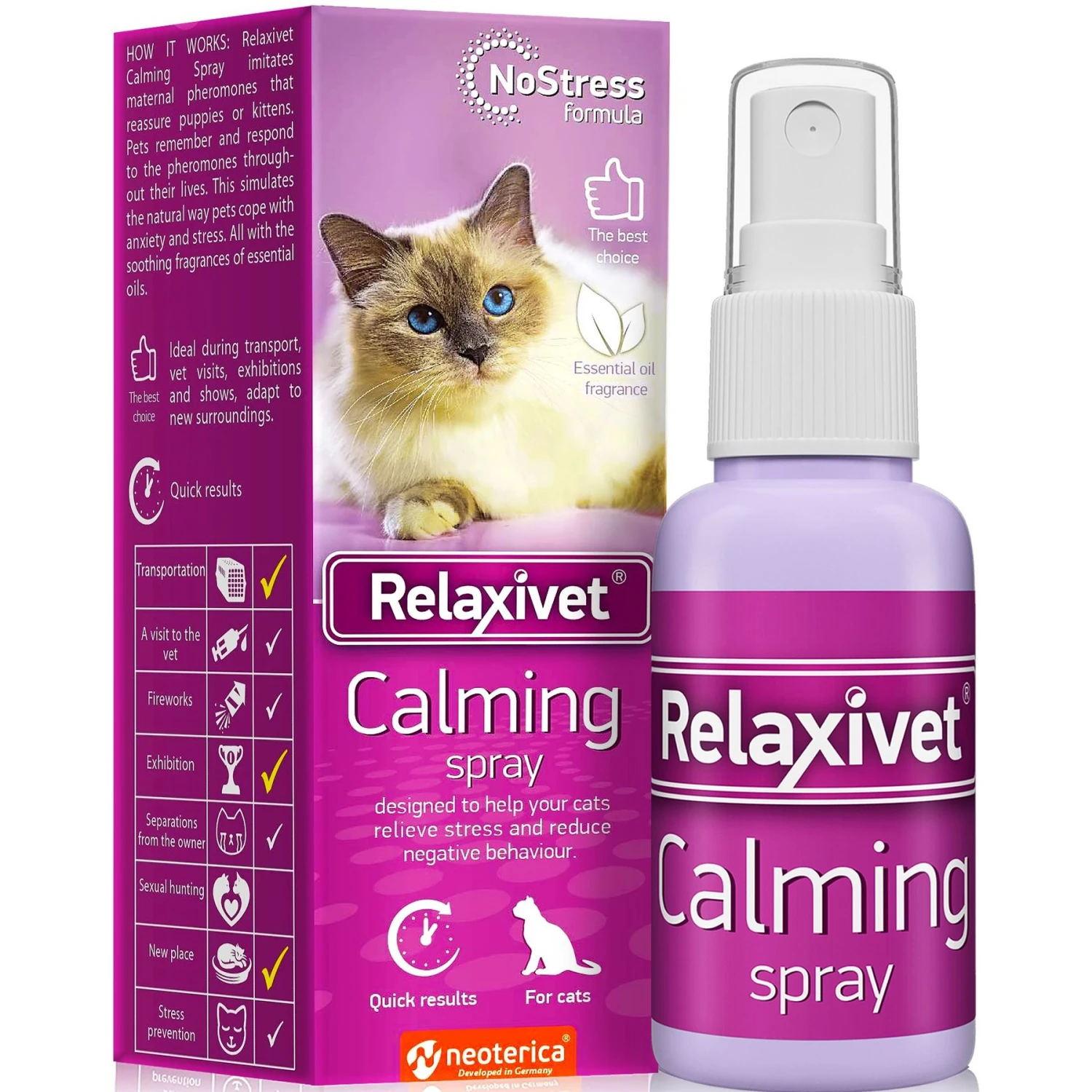 - Calming spray helps your anxious kitty relax and reduces undesirable, stress-related behaviors.