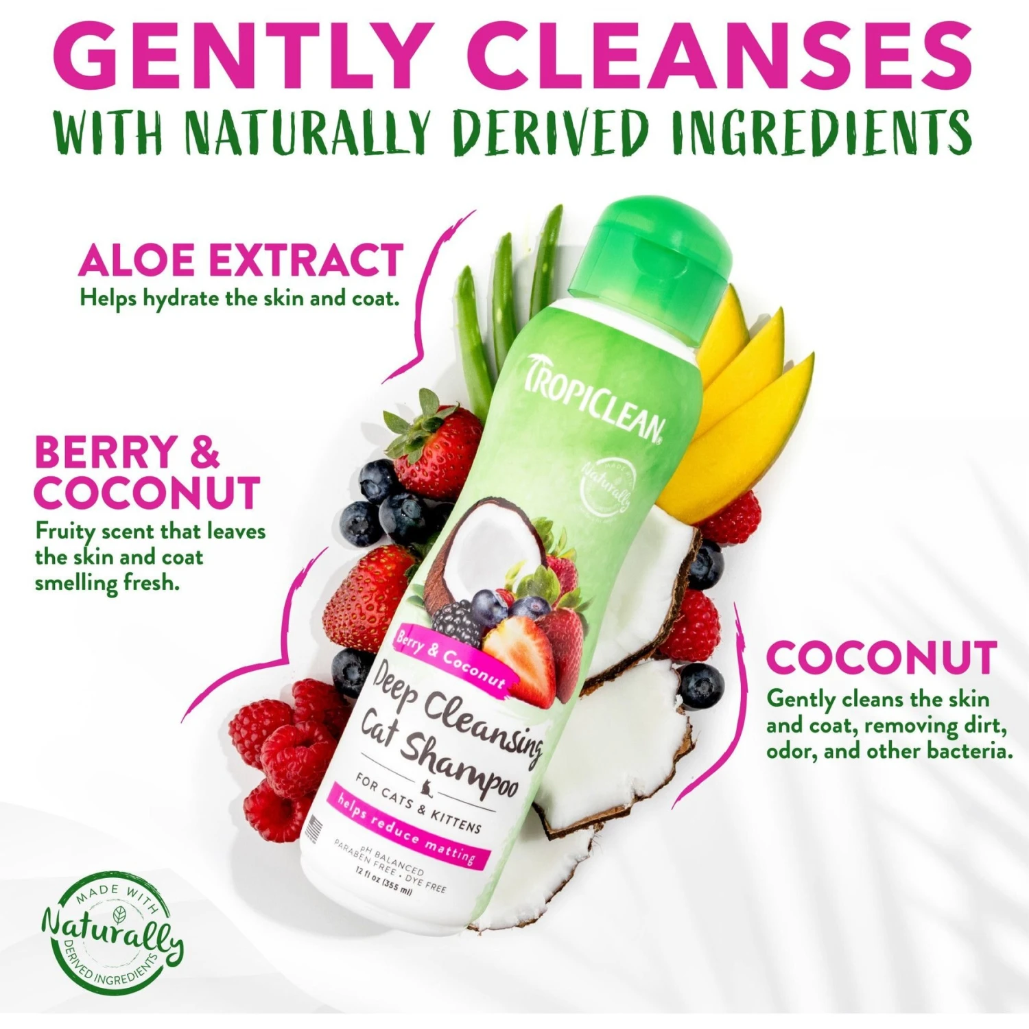 - This deep cleansing cat shampoo is designed for strong odors and derived from natural ingredients such as berries, coconut, and aloe.