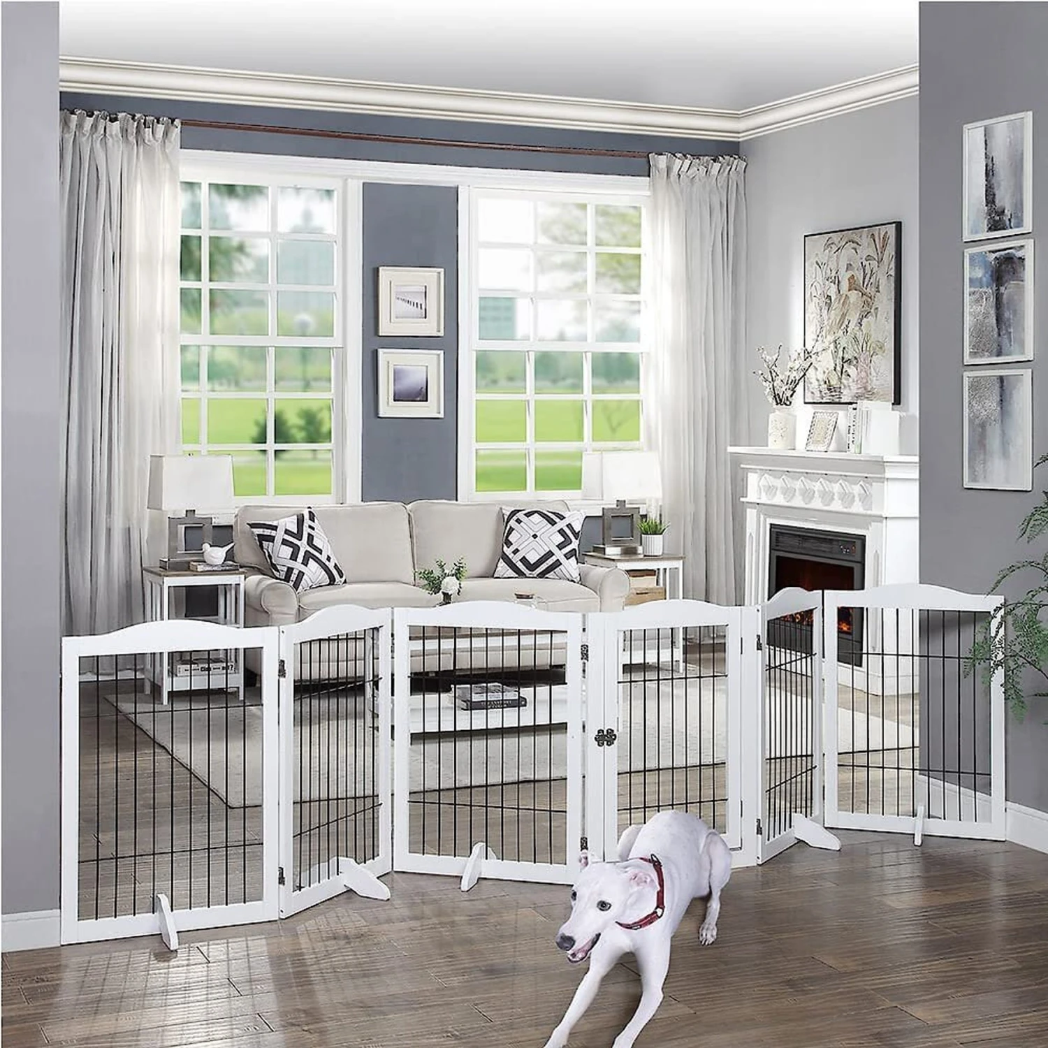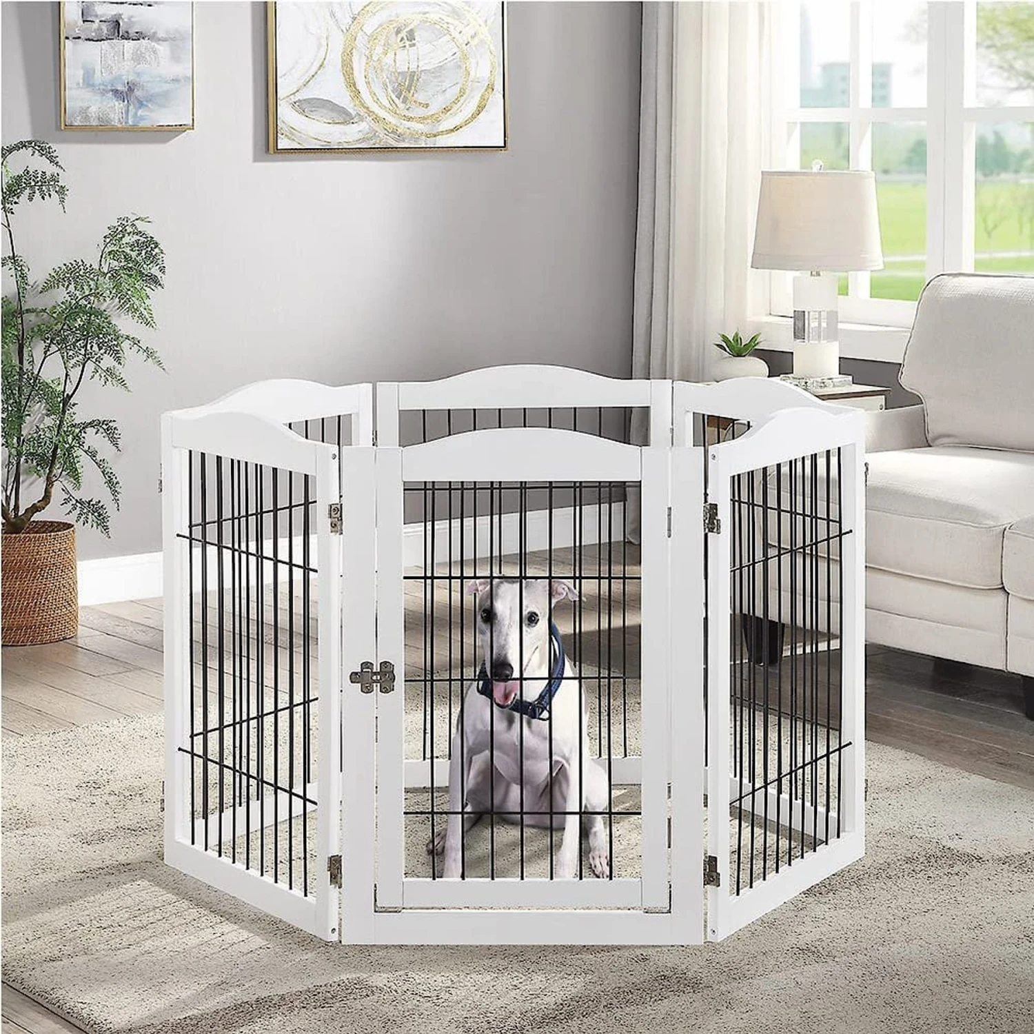 - Use it as a playpen and a comfortable exercise area for your pup. The 360-degree hinges all you to choose a variety of configurations—you can set it up as a rectangle or a hexagon shape.