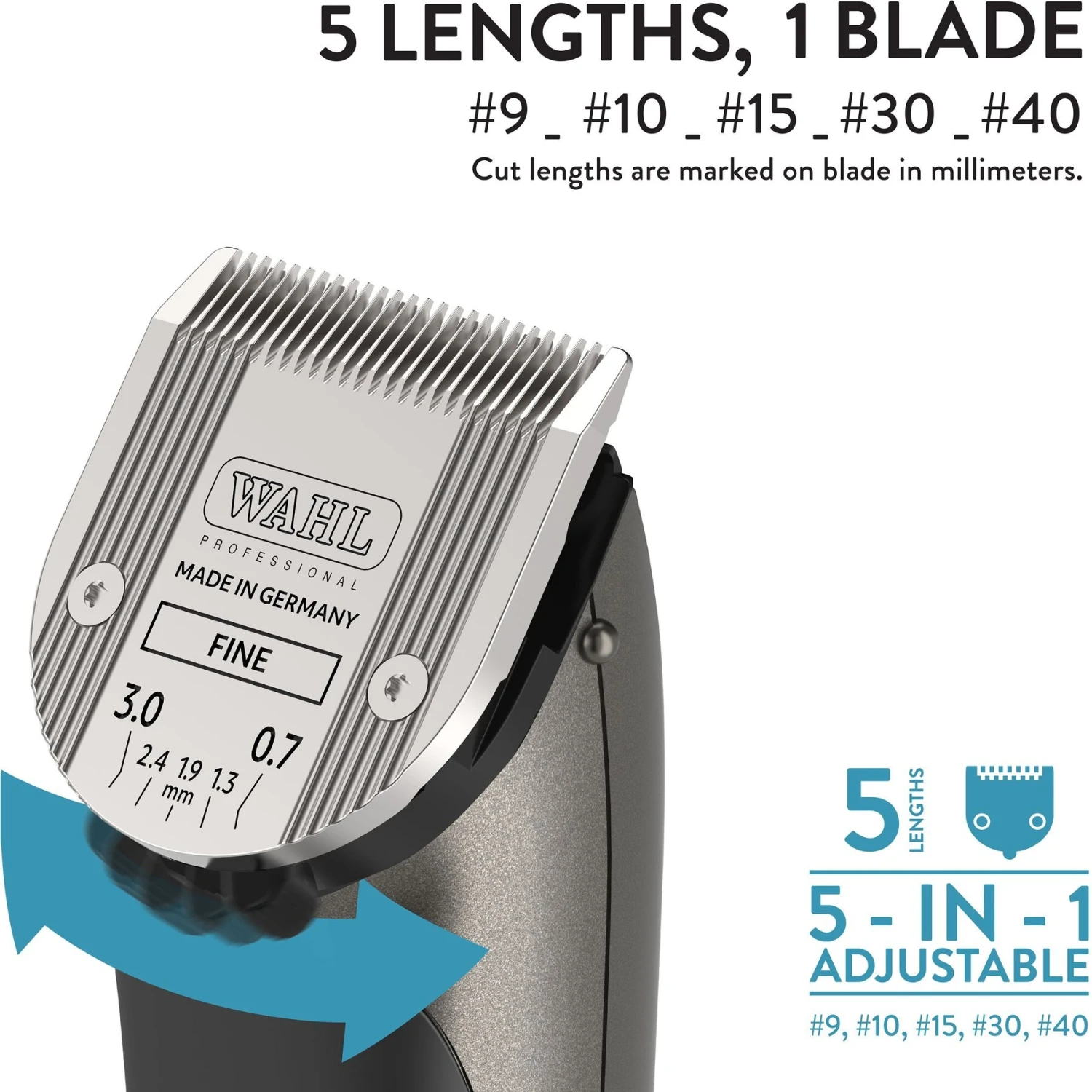 - Versatile 5-in-1 blade technology adjusts the blade to sizes #9, #10, #15, #30 and #40.