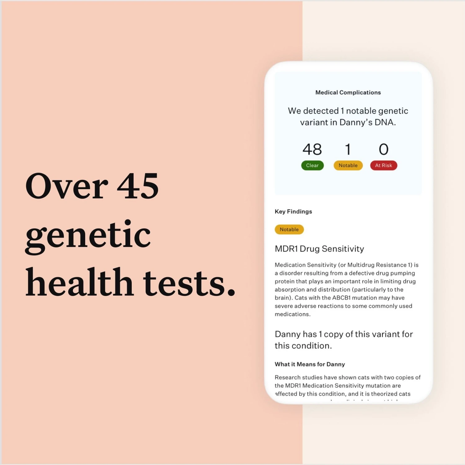 - There are over 45 health tests that screen for genetic conditions and medical complications.